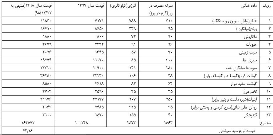 فرامرز توفیقی (رئیس کمیته دستمزد کانون عالی شوراها) در ارتباط با افزایش هزینههای زندگی، بعد از پنجم اسفند ماه به جدول پایهای زیر که مبنای محاسبات سبد خوراکیهاست، اشاره میکند: