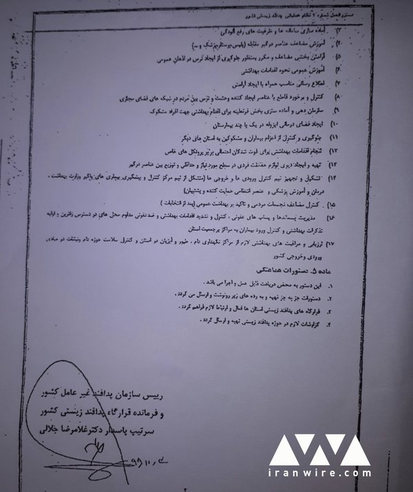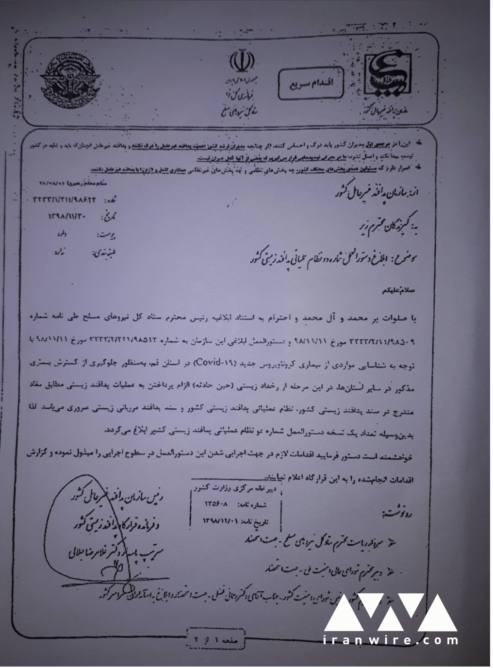 سردار پاسدار «غلامرضا جلالی»، رییس سازمان پدافند غیرعامل و فرمانده «قرارگاه پدافند زیستی کشور» ۳۰ بهمن در نامهای به رییس ستاد کل نیروهای مسلح، دبیر شورای عالی امنیت ملی و وزیر کشور، دستورالعمل شماره ۲ نظام عملیاتی پدافند زیستی کشور را ابلاغ کرده است. این نامه اگرچه محرمانه نیست و فاقد طبقهبندی است اما تاکنون جایی منتشر نشده است. در این نامه دو نکته قابلتوجه وجود دارد؛ نخست اینکه در بخش اول نامه، به ابلاغیه رییس ستاد کل نیروهای مسلح کشور و دستورالعمل ابلاغی سازمان پدافند غیرعامل، هر دو در تاریخ ۱۱ بهمن اشاره میکند. سپس میگوید با توجه به شناسایی مواردی از بیماری «کووید ۱۹» در استان قم و به منظور جلوگیری از گسترش بیماری به سایر استانهای کشور، باید مطابق با سند پدافند زیستی، عملیات پدافند زیستی انجام شود و دستورالعمل آن را ضمیمه کرده است.