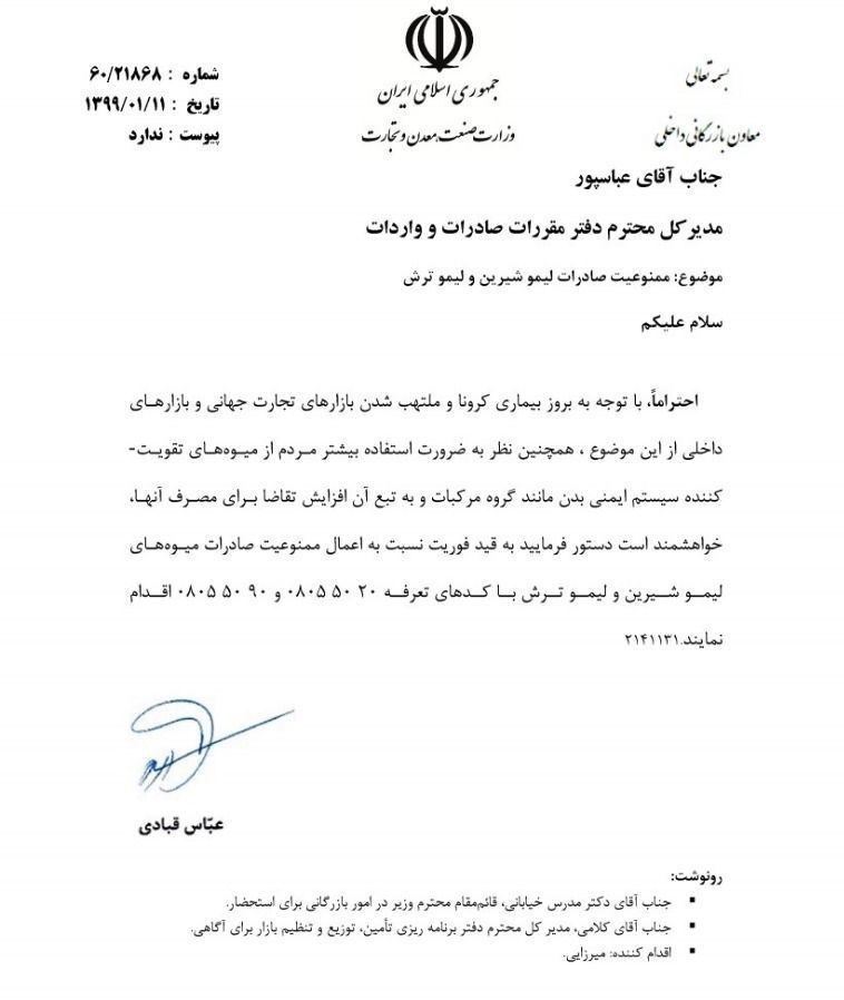 به گزارش خبرنگار اقصادی خبرگزاری تسنیم عباس قبادی معاون بازرگانی داخلی وزارت صنعت، معدن و تجارت با ارسال نامه ای به مدیرکل دفتر صادرت و واردات این وزارتخانه اعلام کرد: با توجه به بروز بیماری کرونا و ملتهب شدن بازارهای تجارت جهانی و بازار داخلی از این موضوع، همچنین نظر به استفاده بیشتر مردم از میوه های تقویت کننده سیستم دفاعی بدن مانند مرکبات و به تبع آن افزایش تقاضا برای مصرف آنها، خواهشمند است به قید فوریت نسبت به اعمال ممنوعیت صادرات میوه های لیمو شیرین و لیمو ترش اقدام نمایید.